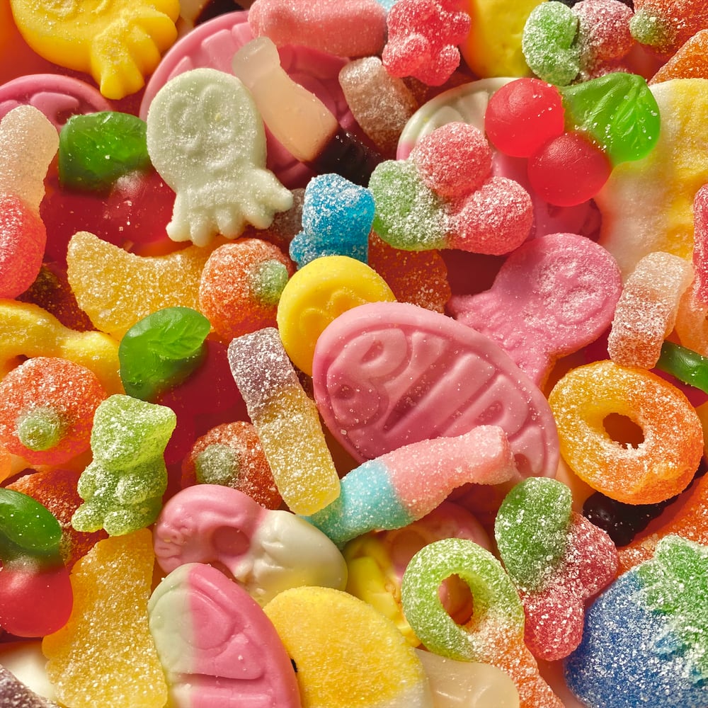 Minimum quantity 5 bags. Feel free to contact us before ordering for personalised mixes, colour themes, particular sweet preferences, Palm Oil free mix, larger mix size, etc. Photographs for example, contents may vary.