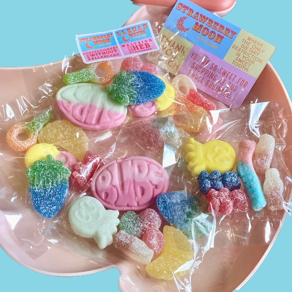 Strawberry Moon is owned by a Coeliac, with a very severe nut allergy, and who follows a vegan diet. All our sweets are made without the top 14 known allergens, and are handled with extreme care when mixing to order. The manufacturers & suppliers we use have also confirmed that they have measures in place to avoid cross-contamination of allergens. If you have any food allergies outside of the top 14 common allergens please be sure to check the full ingredients on the link below. Please note our sweets contain colours E102 & E129 which may have an adverse effect on activity and attention in children.